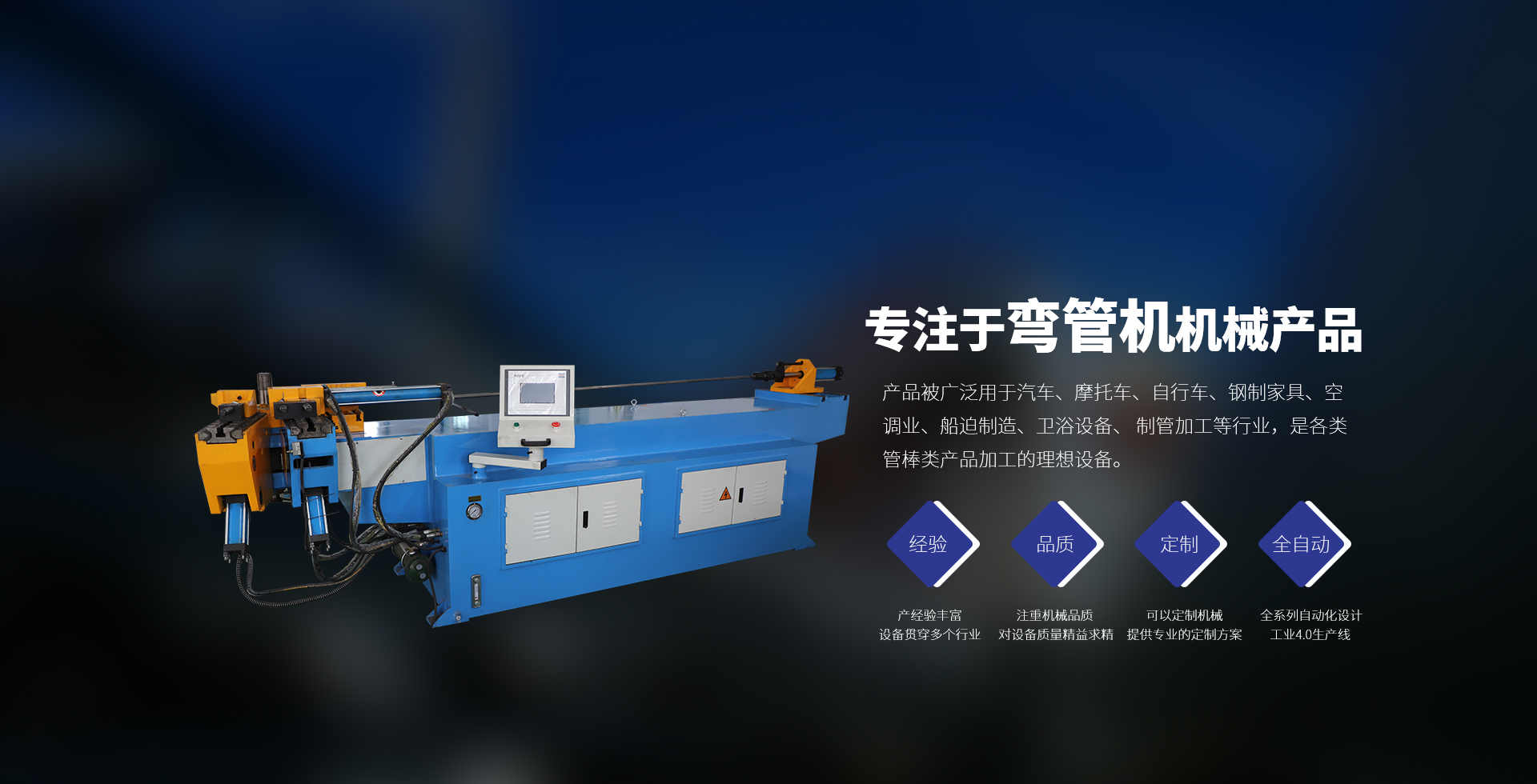 廣泛用于汽車、摩托車、自行車、鋼制家具、 空調(diào)業(yè)、船迫制造、衛(wèi)浴設(shè)備、制管加工等行 業(yè),是各類管棒類產(chǎn)品加工的理想設(shè)備。